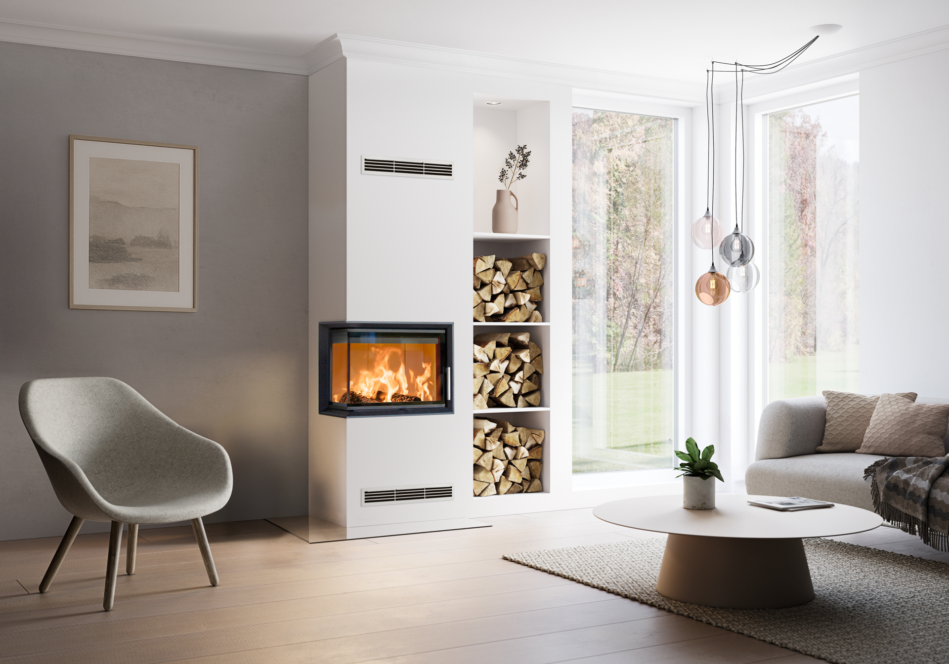 Scan 5103 er en hjørneinnsats med horisontalt flammebilde. Den leveres med glass på front og venstre side.