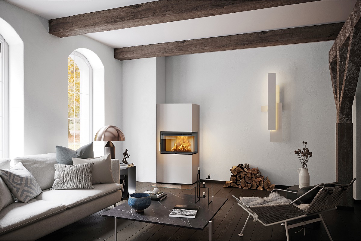 Scan 5107 er en peisinnsats med diskret design, men likevel stort særpreg, som lar deg nyte flammene gjennom den tosidige glassdøren, noe som gir følelsen av å sitte ved en åpen peis. Luftinntaket reguleres enkelt med bare én hendel og et vakkert håndtak og en svart ramme rundt glasset fullfører helhetsinntrykket. Velg mellom en høyre- eller venstrehengslet modell som kan installeres midt i rommet eller passer perfekt i et hjørne. Du kan også installere ekstra varmelagrende steiner i begge peisinnsatsene. Disse legges skjult inn i toppkammeret og gir ekstra varme i opp til 12 timer etter at siste vedkubbe er lagt i.